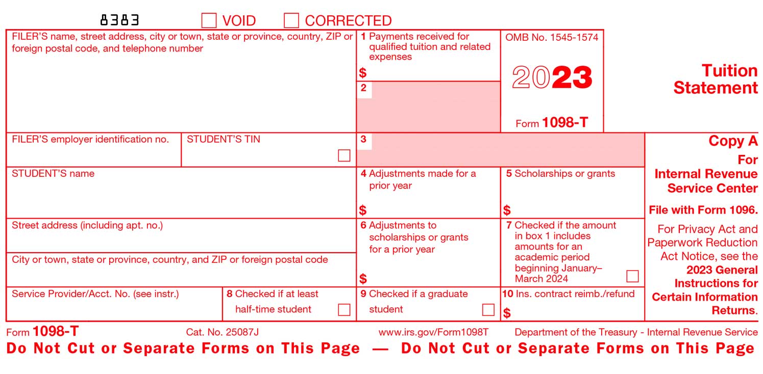 Below is a blank sample of the 2025 Form 1098-T, which you will receive by January 31, 2026, for your general reference. See the PDF for more information about Form 1098-T.