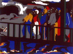 In 1941, he won accolades for his epic series The Migration of the Negro, consisting of 60 narrative panels, which depicted the mass movement of thousands of black Americans from the rural South to the industrial North that began after World War I. As a result of this series Lawrence, at the age of 24, became the first black artist to be exhibited in a major art gallery (Downtown Gallery in New York City.) The narrative works that he continued to create in his paintings and prints, were bold in color, texture, line and pattern with flat shapes in pure colors. He said that his pictures expressed his life and experiences, and man's search for the ideal society. Other series included This is Harlem (1940s), Hospital (1949), Struggle: From the History of the American People (1955-56) and Hiroshima (1982). Lawrence taught at numerous New York City universities and schools around the country.