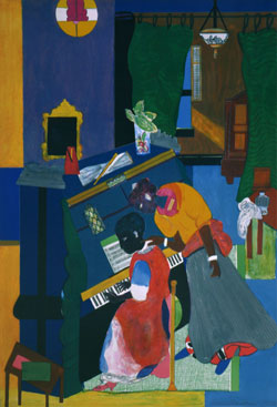 Throughout the years, Bearden continued his exploration of the medium. A songwriter as well, Bearden used the rhythms and improvisations of blues and jazz in many of his creations. His works were universal in nature and depicted every day life in rural and urban America, industrialism, music, ancient myths and traditional stories. As an art historian Bearden researched and wrote books educating the public about African American artists.