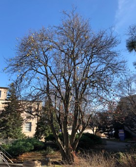 The Chinese Quince is one of Hofstra’s most notable trees. It was originally saved from the chainsaw by the Hofstra University Arboretum along with residents from the town of its original location, Thomaston, NY by its move here to campus in the autumn of 1990. Presently it stands at 40 feet in height which is as tall as the tree is expected to grow. Delicious jam has been made at Hofstra from its 6” oblong shaped yellow fruit. The Chinese Quince is a member of the “Rose Family” and flowers pink in late May. Its deep green foliage turns a brilliant scarlet in fall. The exfoliating black bark peels off in irregular sheets exposing multi-colors of greens, browns and orange.