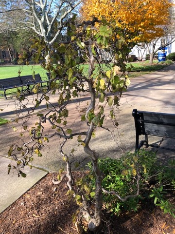 Harry Lauder’s Walking Stick (Corylus avellana “contorta”) is one of the most unusual shrubs you will see, situated on either side of the entrance to Brower Hall. This shrub flowers in April, has simple, toothed leaves, and its fruit is edible. The most striking feature of the tree however, as the name implies, is the contorted limbs, growing in a corkscrew manner toward the sky. Individuals working in the art of Ikebana often use the limbs of this tree in their arrangements.