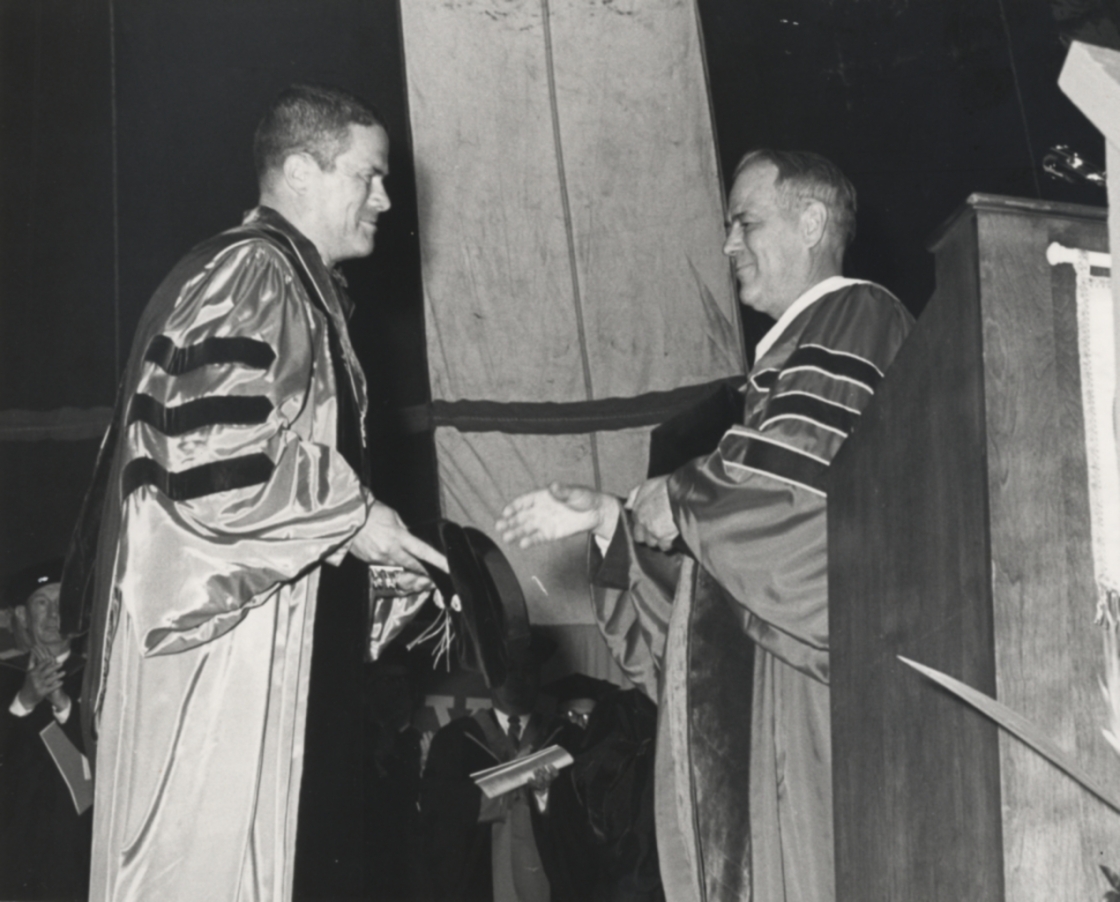 One of the main, one of the immediate problems-the problem of space-this, remember, is right after the war, GIs were coming back in overwhelming numbers and there was just a very real pressure for space. I think one of my first official acts, certainly, was to break ground for the library, which had been already decided upon. The campus really was transformed in those next eight years. Everything on the north campus was built. The caliber of the students and faculty was increased rapidly now. Now, I inherited a good faculty, I don’t think there’s any question about it. There were some very good people there. The caliber of the people we were able to bring in, because we did do more in the way of insisting on advanced degrees, terminal degrees, than had been done right after the war.