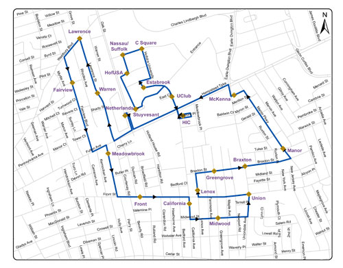 | Netherlands | Student Center | Hof USA | Nassau Suffolk | C-Square (3 stops) | Phys Ed Bldg | Dome Road | Hagedorn Hall | Margiotta | California Ave (2 stops) | Breslin | Weed | Admissions | Hempstead Sta | Mineola Sta |