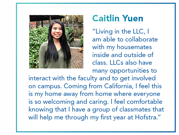 The learning experience is not limited to the four walls of the classroom or even to the borders of the campus. Through these energetic living-learning communities, Hofstra students are exposed to environments that are intellectually stimulating, supportive, and conducive to building lasting friendships and a memorable first-year college experience. If you are interested in registering for a cluster or seminar associated with an LLC or would like more information about this program, visit the First-Year Connections website.