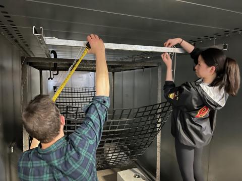 Esther and Professor Segal hanging the project in the industrial oven at a facility in Bethpage, NY.
